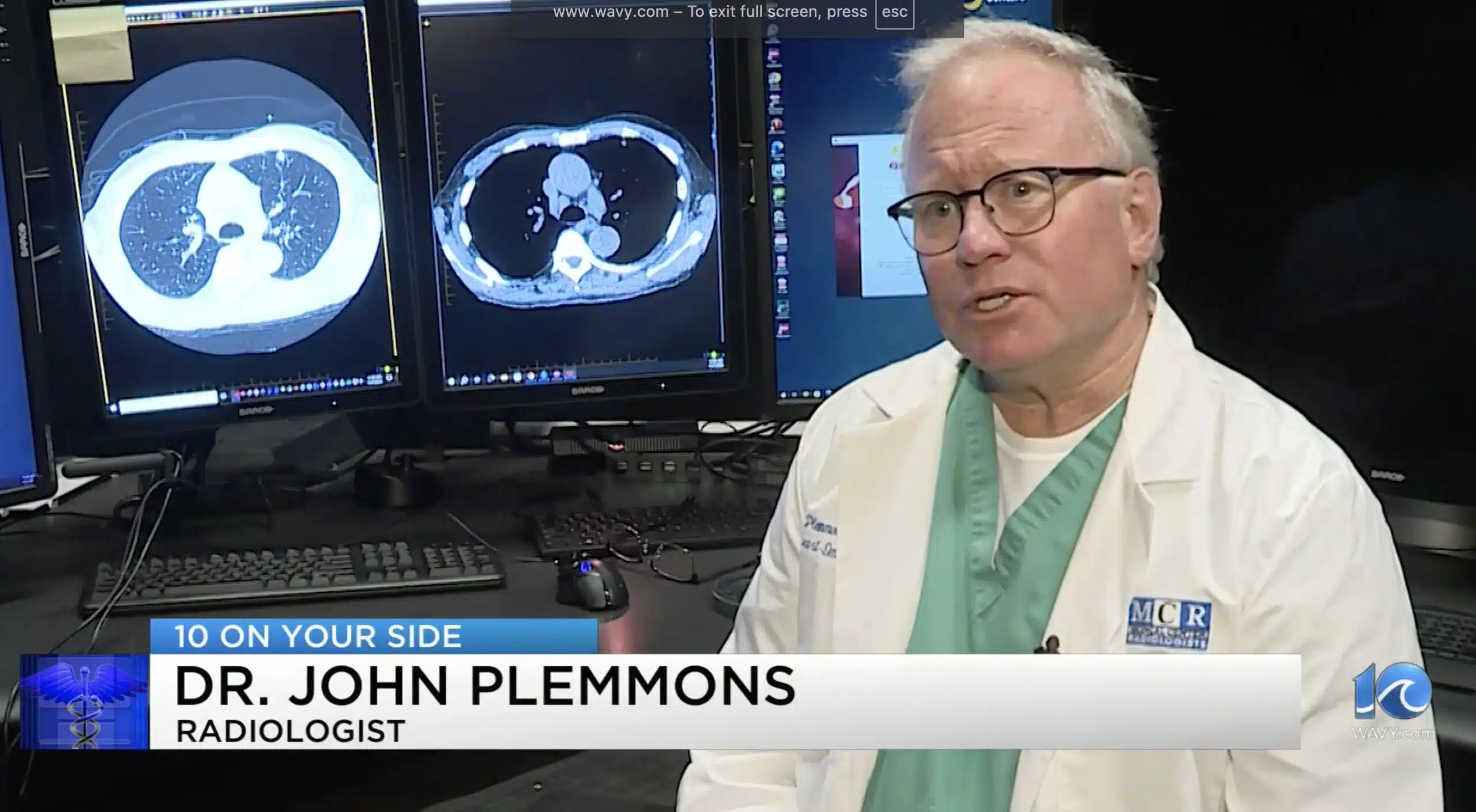 MCR Radiologist John Plemmons, MD, was recently interviewed for a feature spot on WAVY TV News 10 promoting lung cancer screening efforts. Lung cancer screening with a low-dose CT scan is recommended for people between the ages of 50 and 80 who have a history of heavy smoking. Specifically, people who have smoked the equivalent of one pack of cigarettes per day for at least 20 years are considered at high risk. Those who are still smoking or who have quit within the past 15 years are also candidates for the testing. Dr. Plemmons encourages everyone who meets the criteria to talk to their healthcare provider about getting screened. Traditionally, by the time lung cancer is symptomatic or it’s identified, 80% of the patients are going to have a disease beyond the small, localized area,” Plemmons said. “But we know that if we catch them earlier, the five-year survival rate is almost 60%.” Low-dose CT scans can detect lung cancer as early as Stage 1 or 2, which can make all the difference.